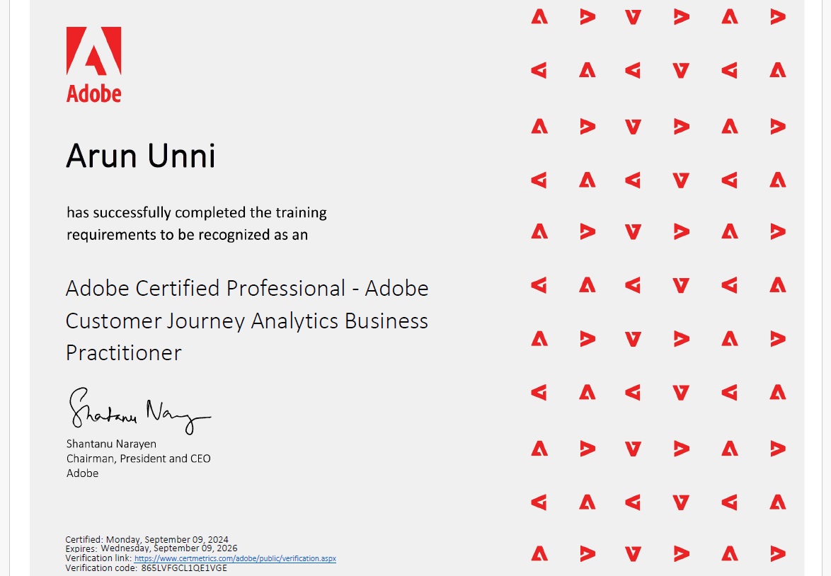 This Certification demonstrates proficiency in leveraging Adobe Analytics and Adobe Experience Cloud to optimize business strategies. It validates skills in analyzing Web Analytics data from Adobe Data warehouse, personalizing experiences, and driving effective digital marketing campaigns.